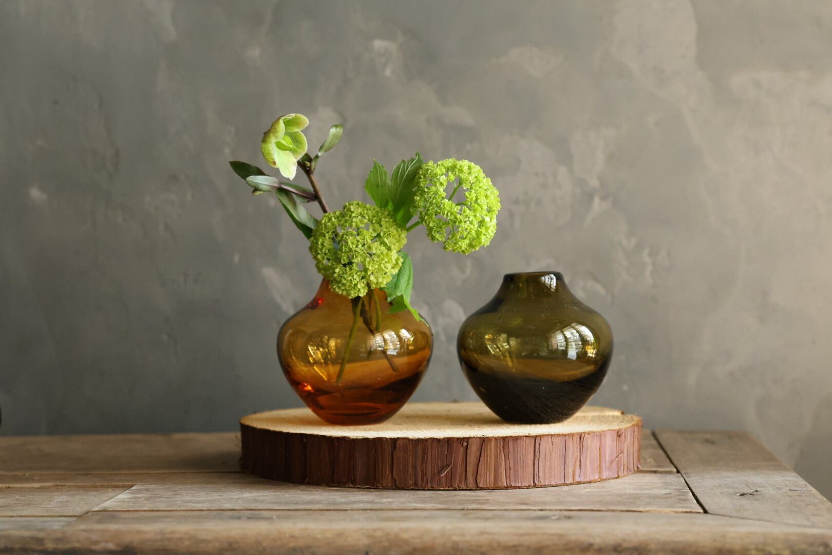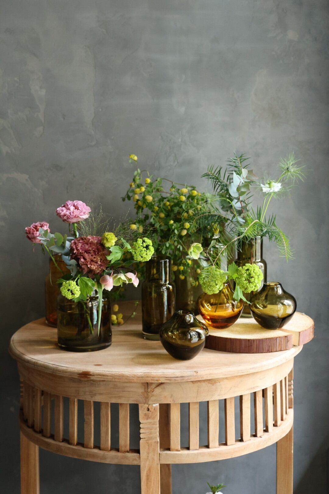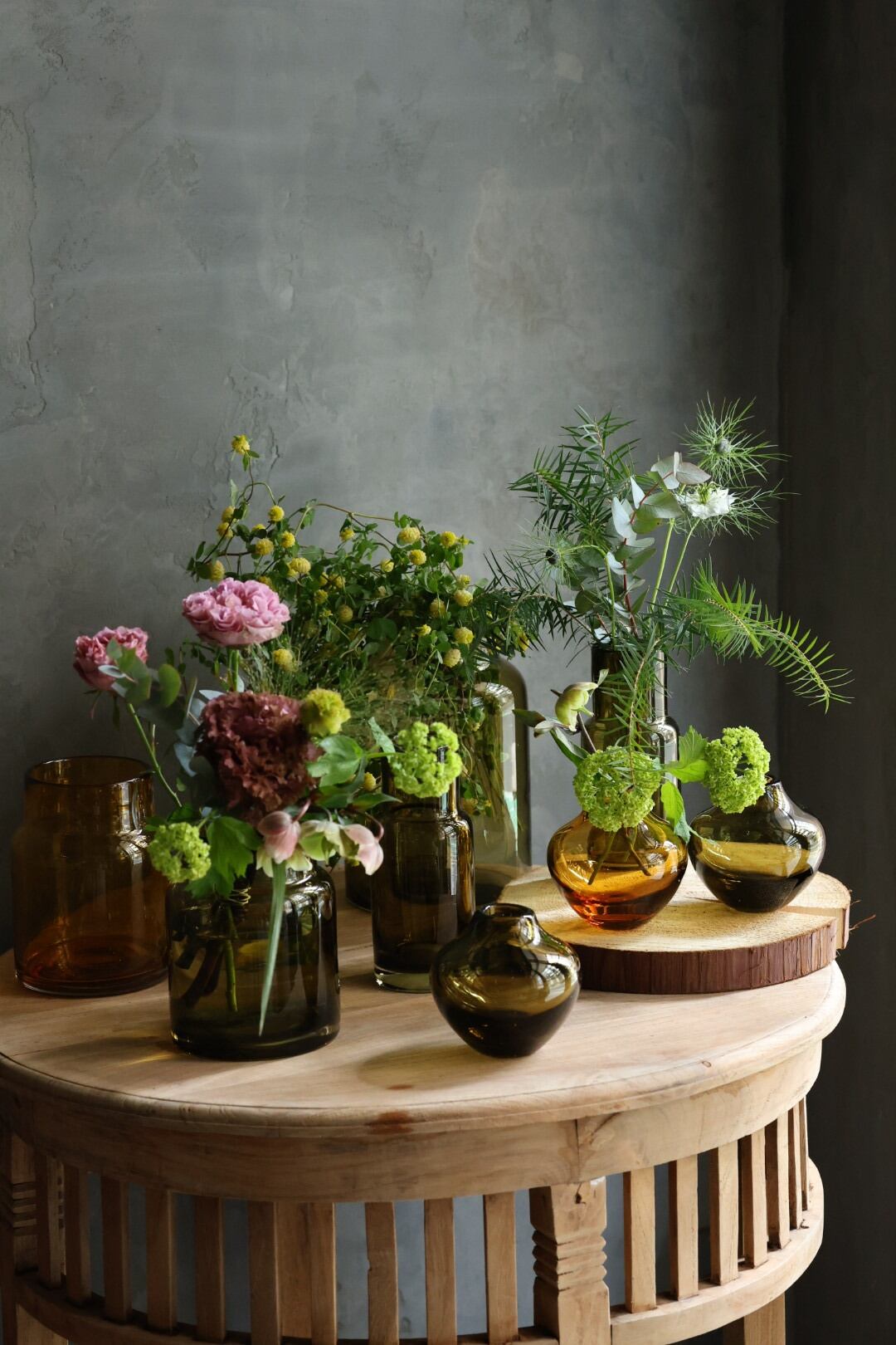 「DGシリーズ」はマウスブローと手仕上げで一点一点、手作業で作られています。生花やドライフラワー、植物と合わせやすい、飽きのこない機能的なデザインです。