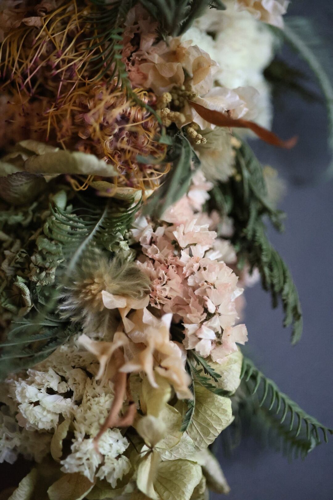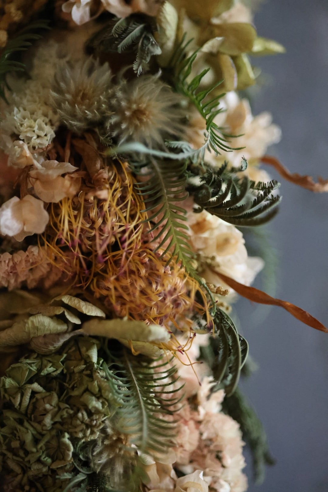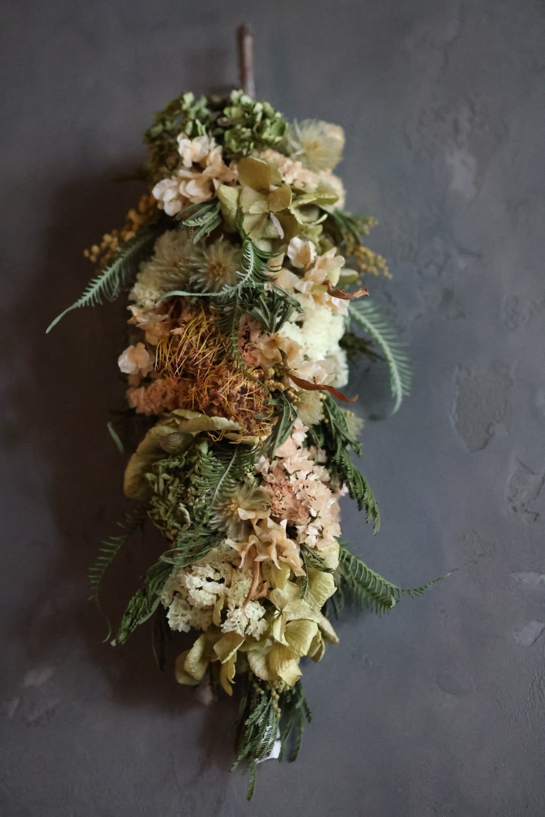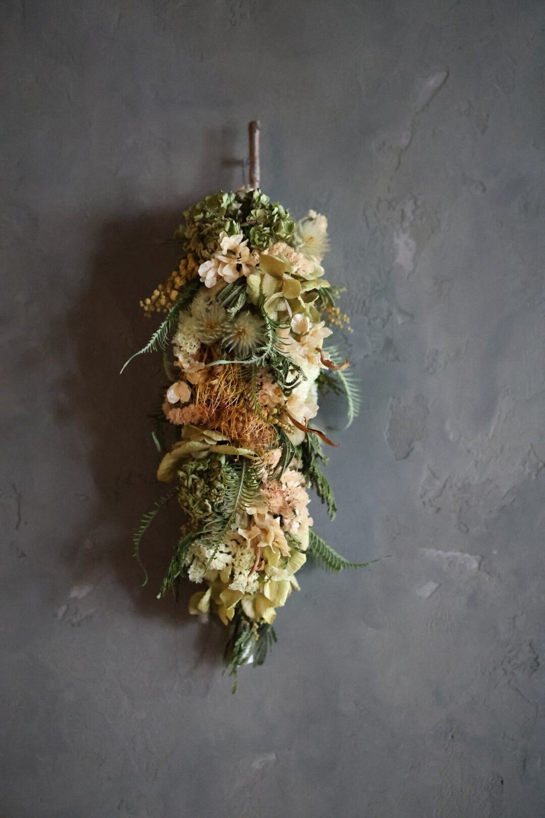 紫陽花やスターチス、ピンクッション、ミモザなど…柔らかなイエローやオレンジを詰め込みました。優しい陽射しのようなガーランド。