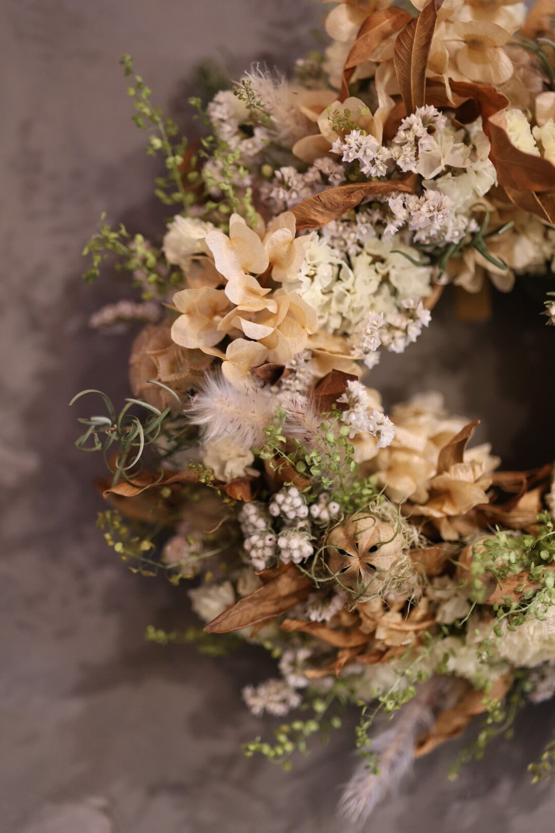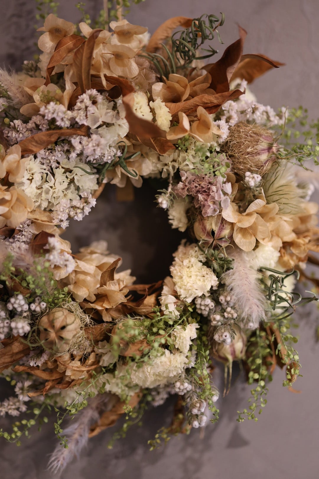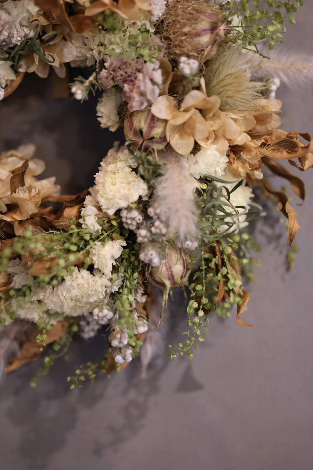 月明かりのような優しい色合いのスターチスを使ったリースです。