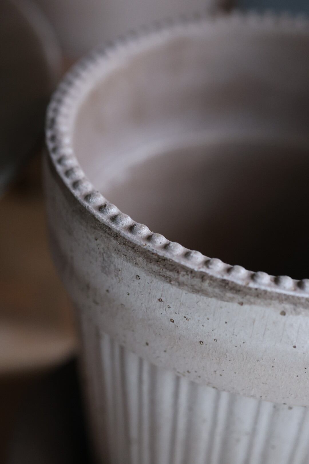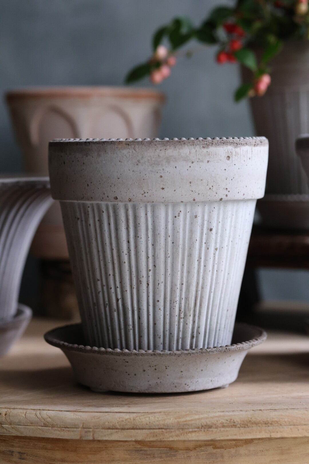 フランスのモンマルトルのフリーマーケットでの散策中に、デザイナーのステフェン・ベルグがロマンチックなSimona Pot(シモーナ)のアイデアを思いつきました。Simona Potは古いラテンクォーターの美学を象徴し、19世紀のフランスのクラシックな家や庭をイメージしています。上部のリムにはテンポよく並ぶ小さなパールが施され、美しいディテールを引き立てています。イタリアのトスカーナの熟練職人によって一つ一つ丁寧に手作りされています。