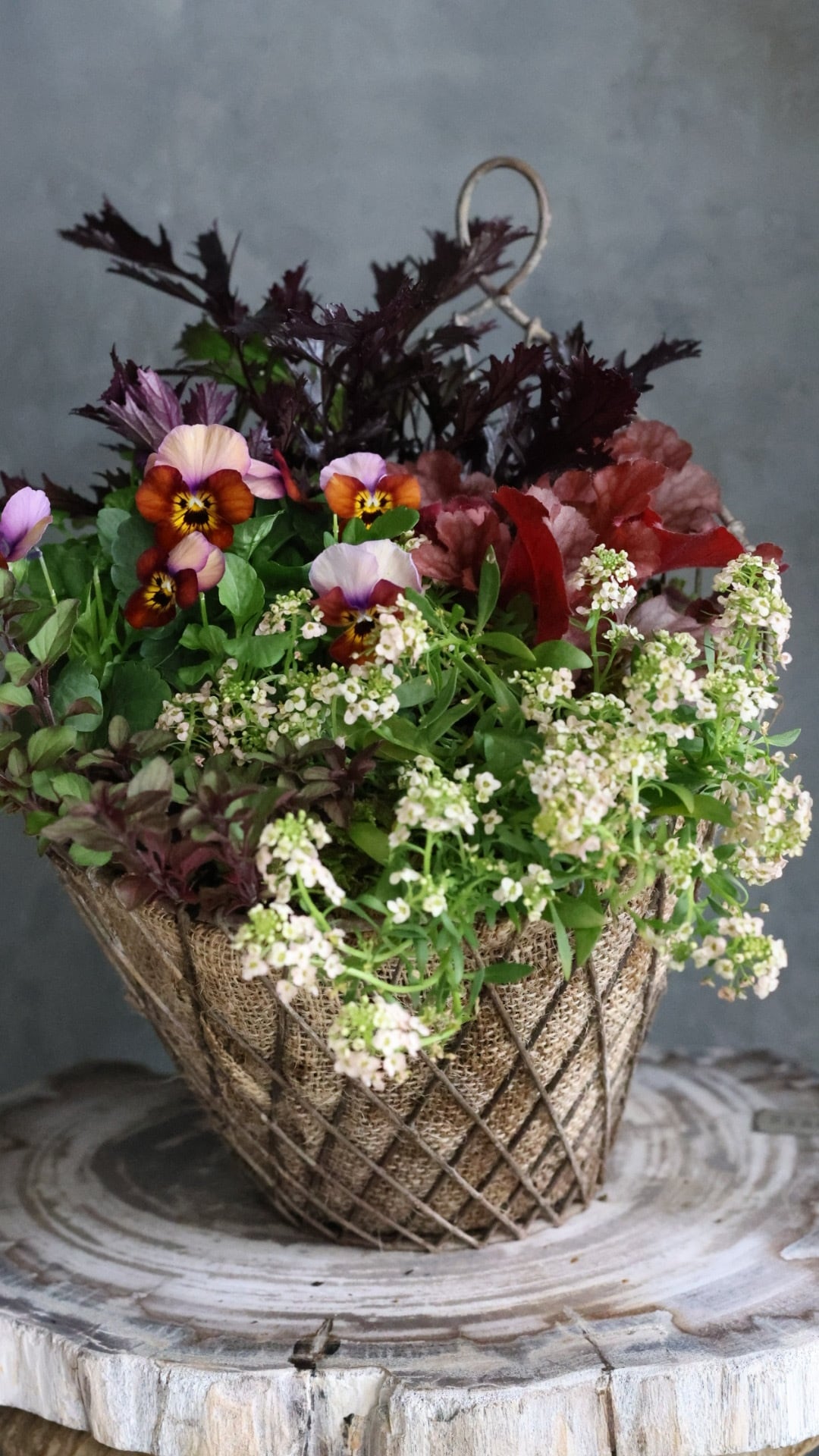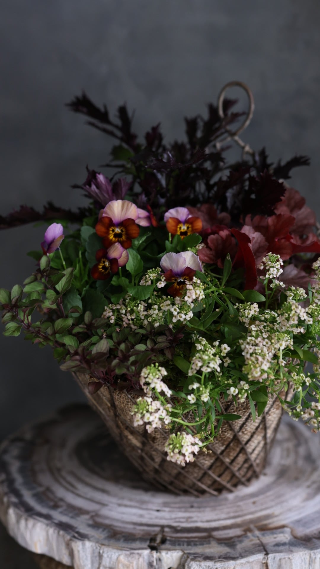 アンティーク加工のワイヤーメッシュのかごに寄せ植えしています。