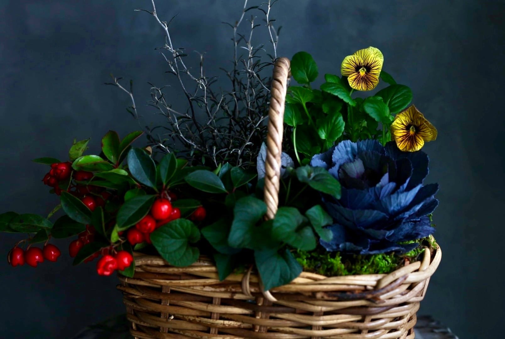 ビオラタイガーアイと赤い実のチェッカーベリーが主役の天然素材のバスケットに植えている寄せ植えです。