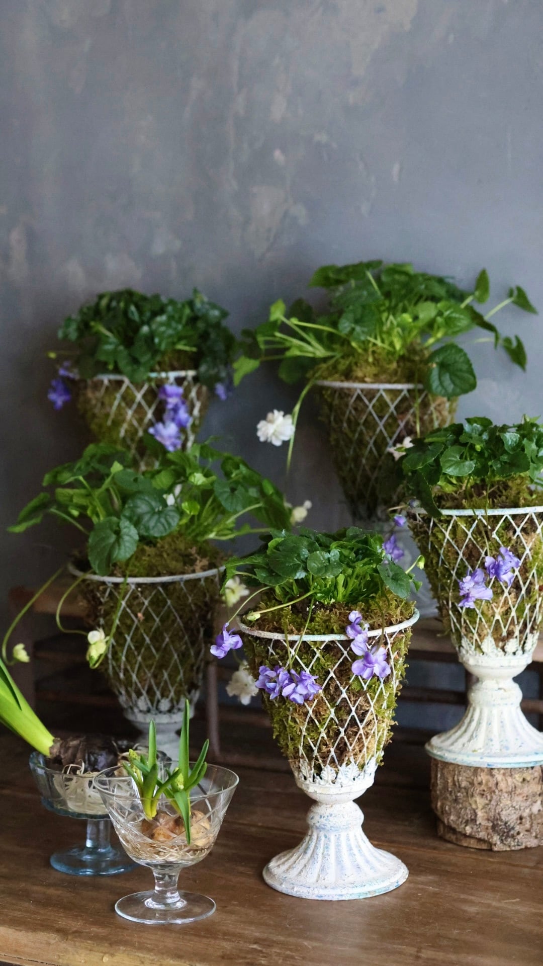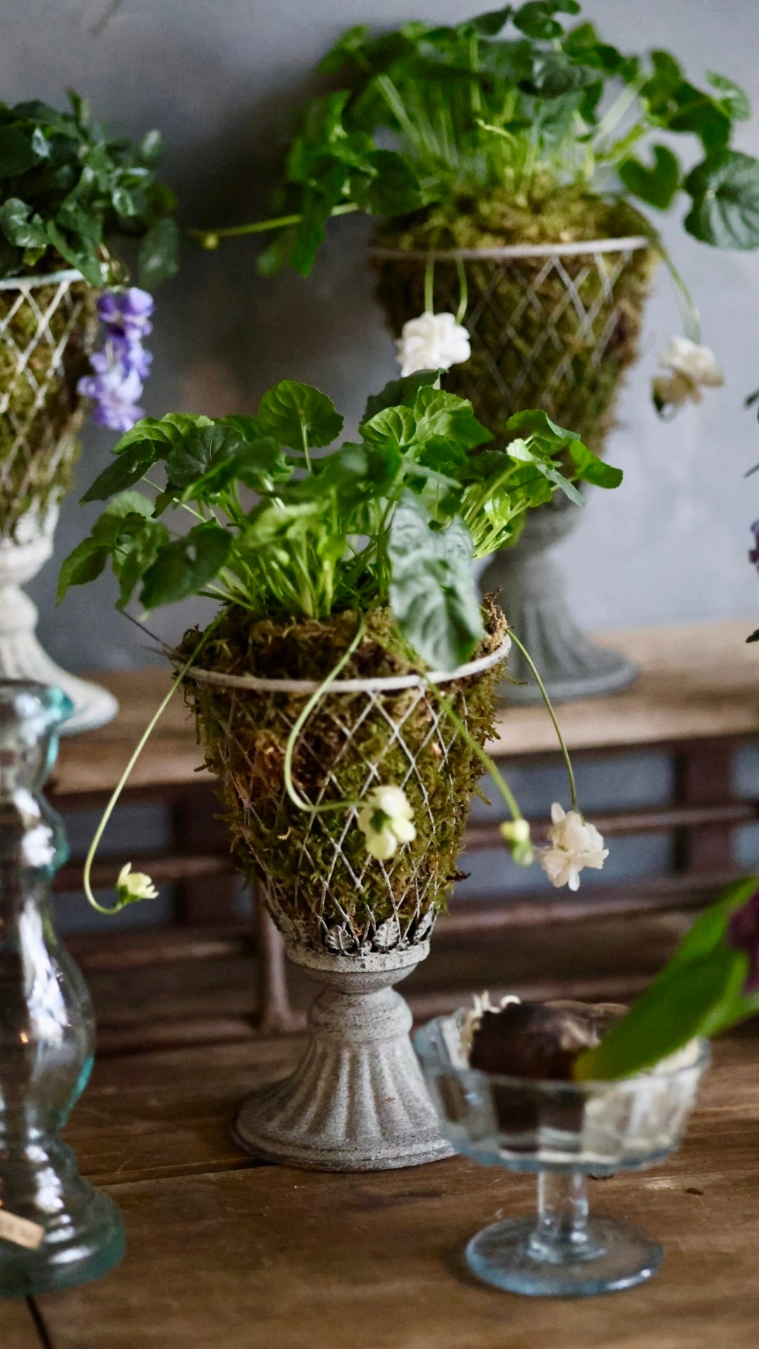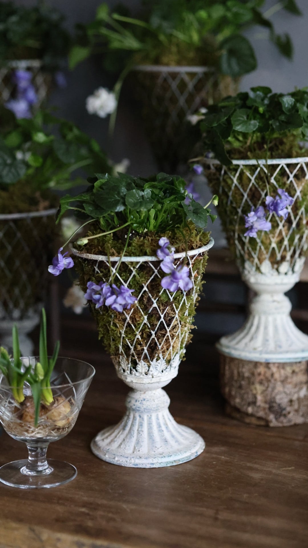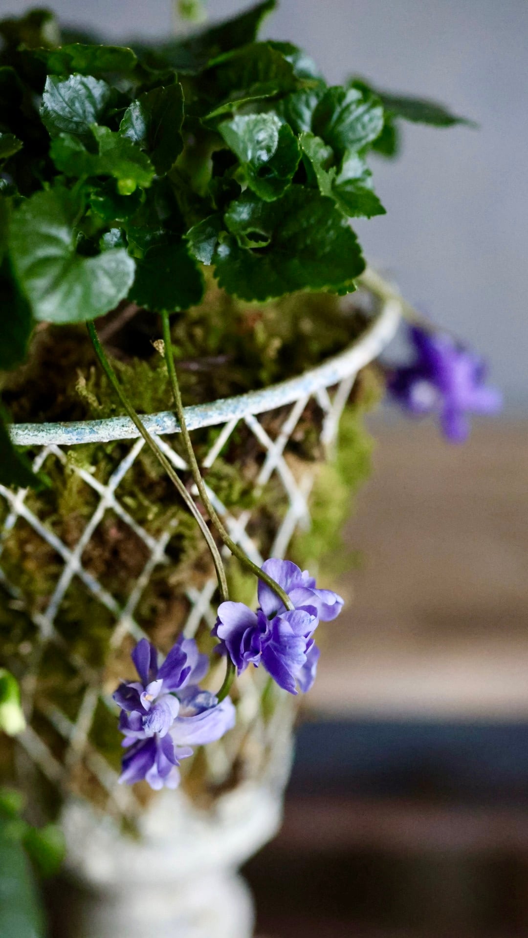アンティーク加工されたメッシュのバスケットに植え込みました。