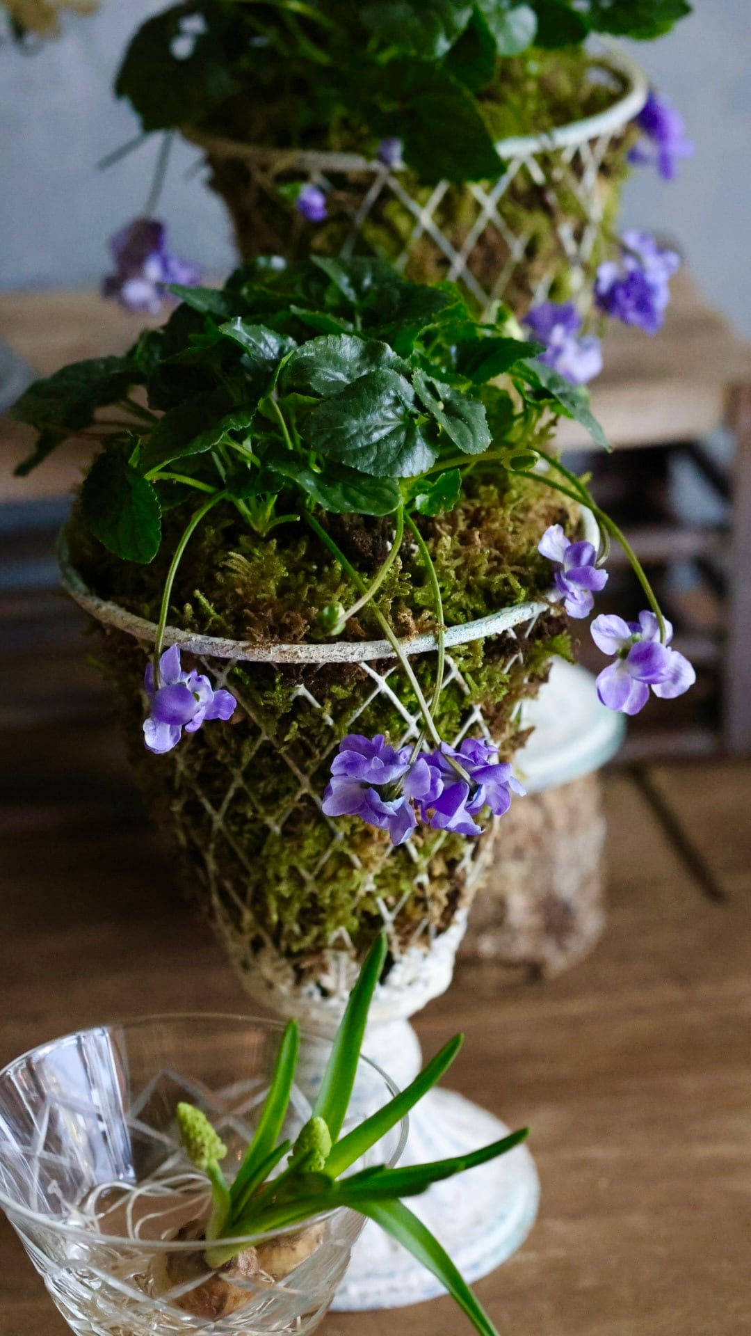 白花はグレーのバスケットに。紫花は白いバスケットにセットしています。