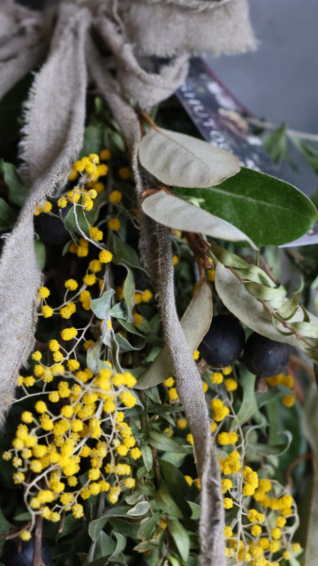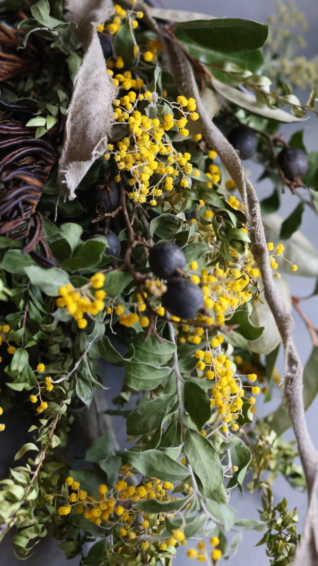 今が旬のパールアカシアに、アンティークな雰囲気の実ものとリボンを合わせました。