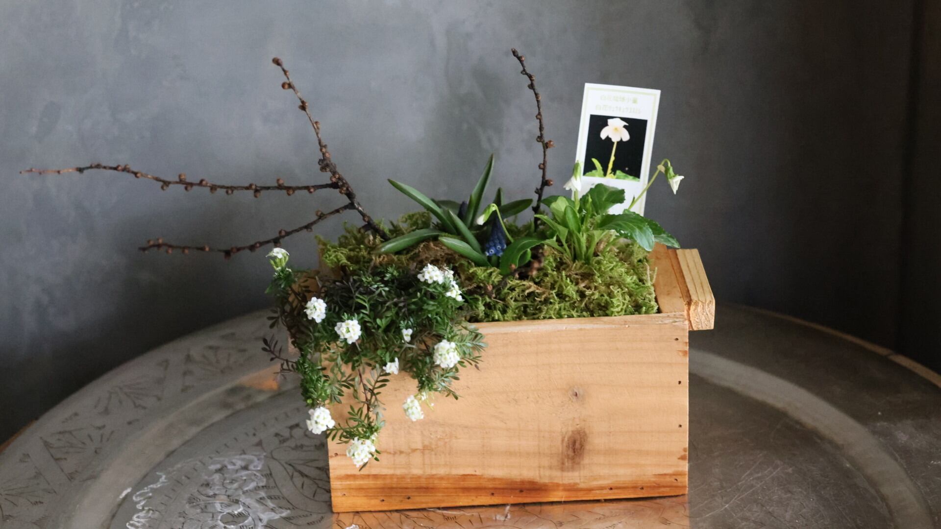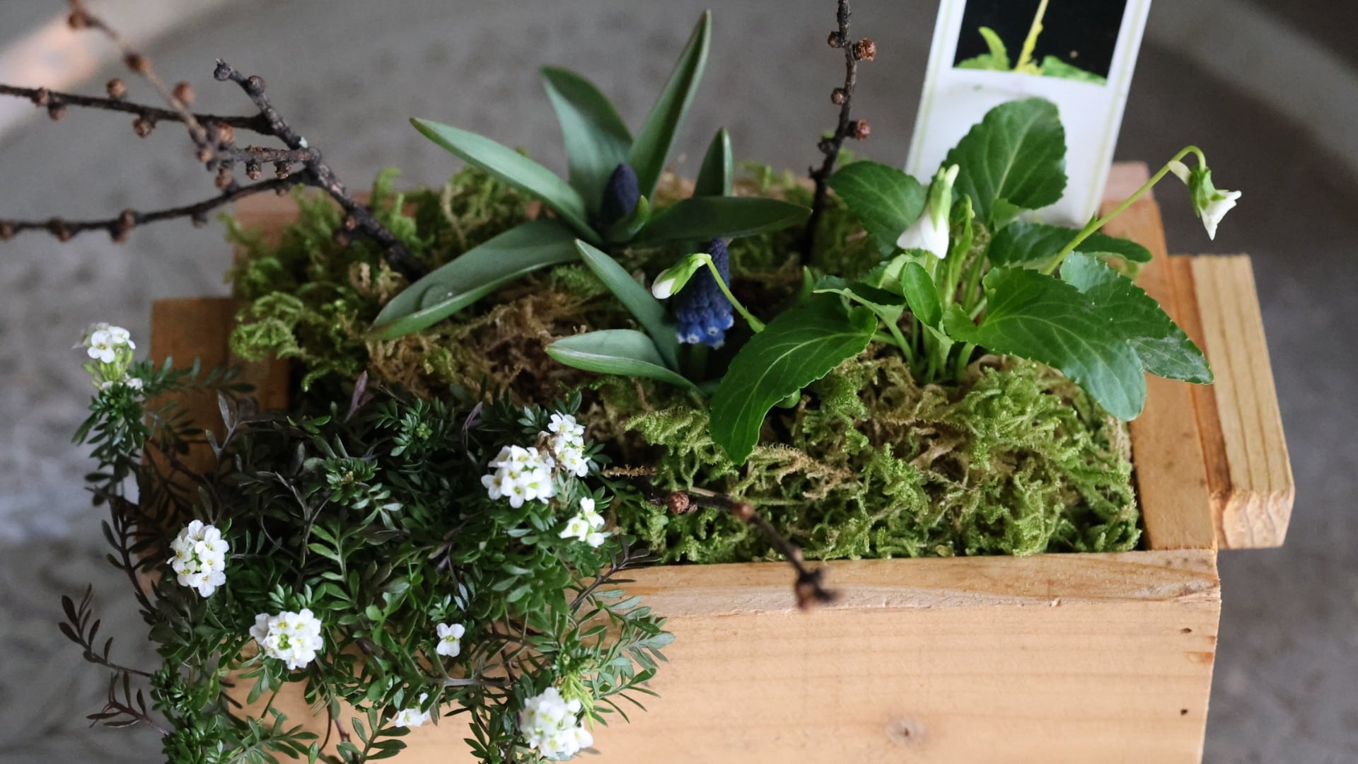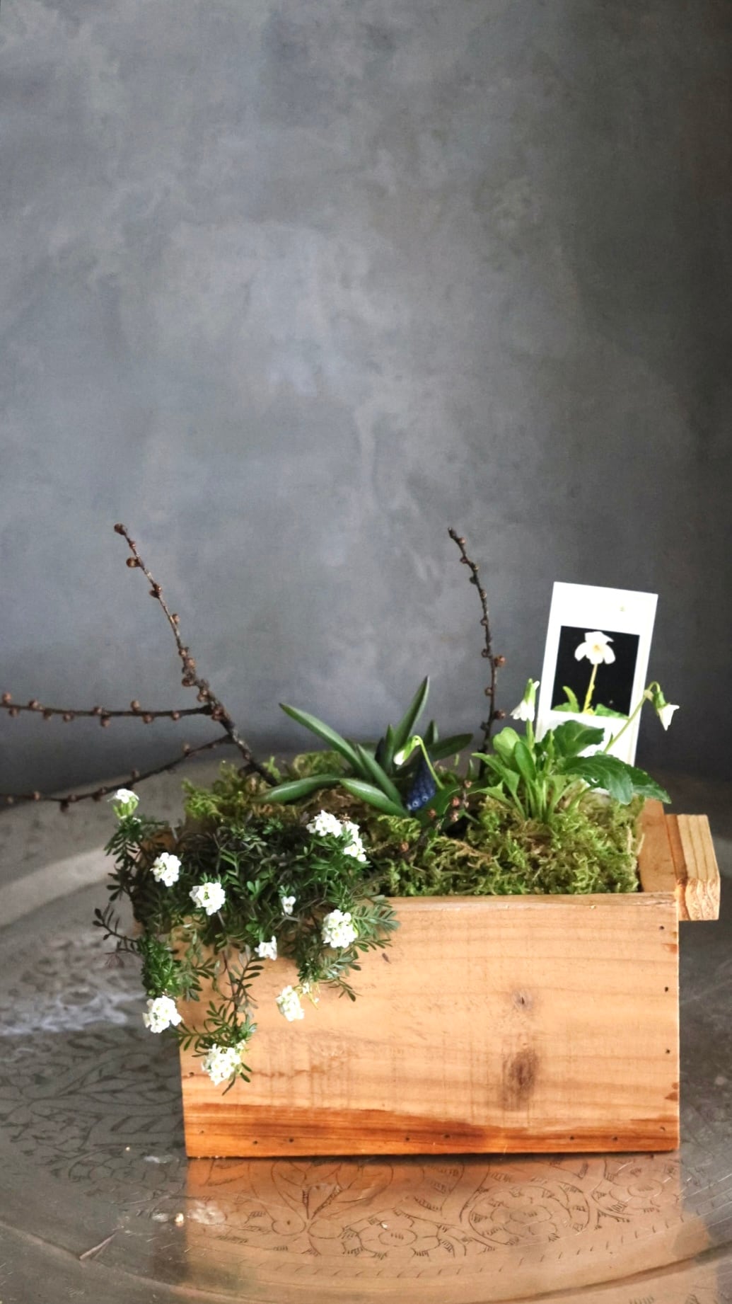 木箱に春をお知らせしてくれる小さな植物たちの寄せ植えを作りました。