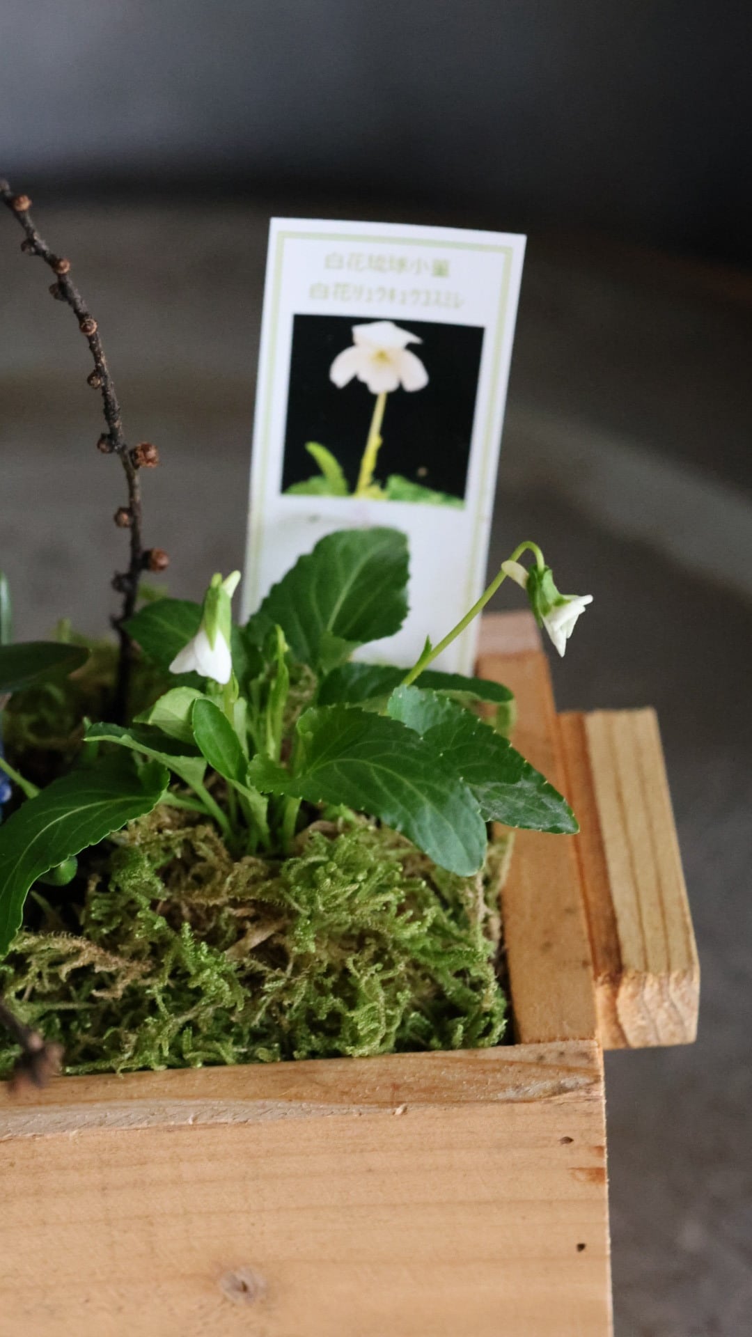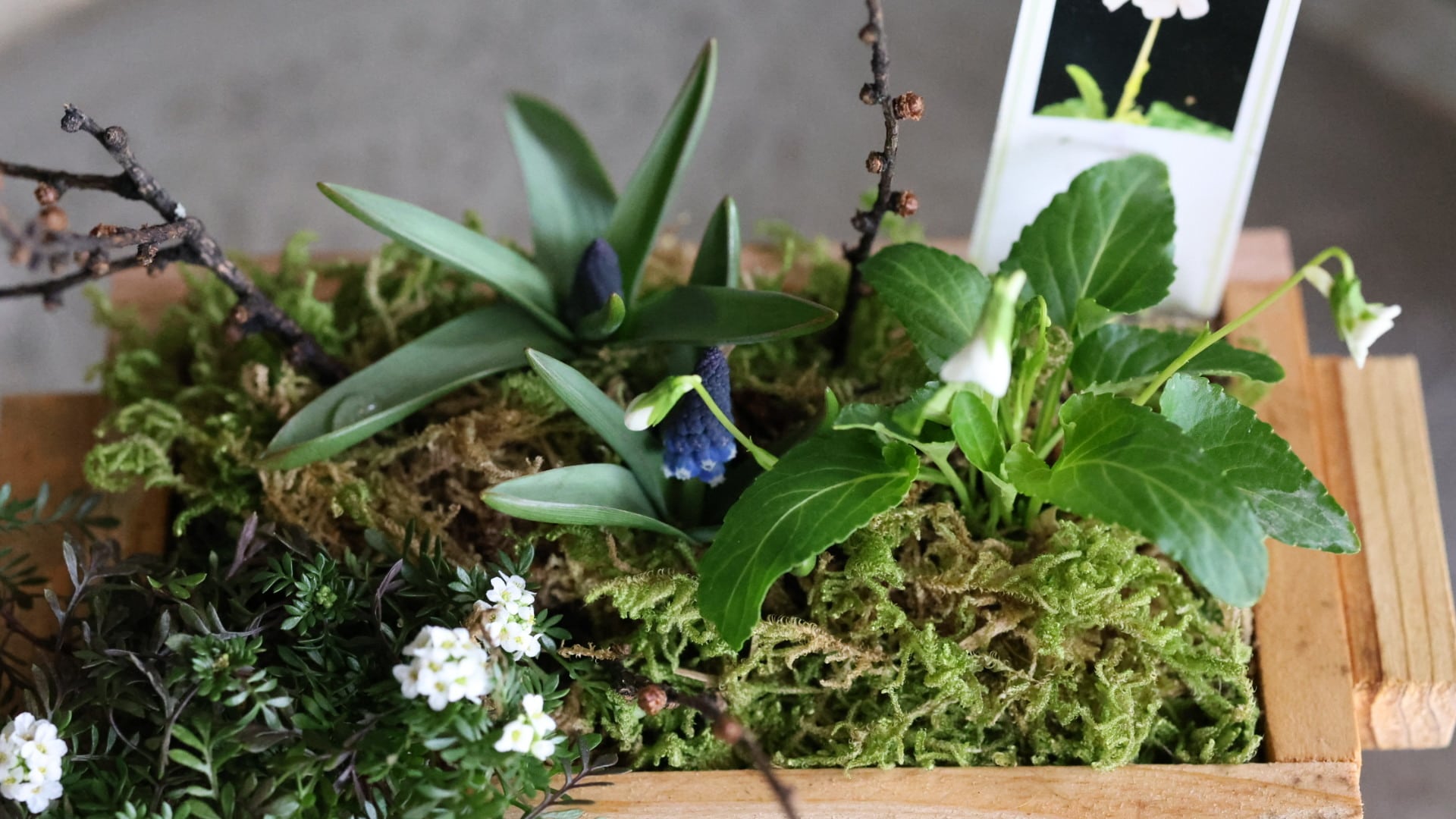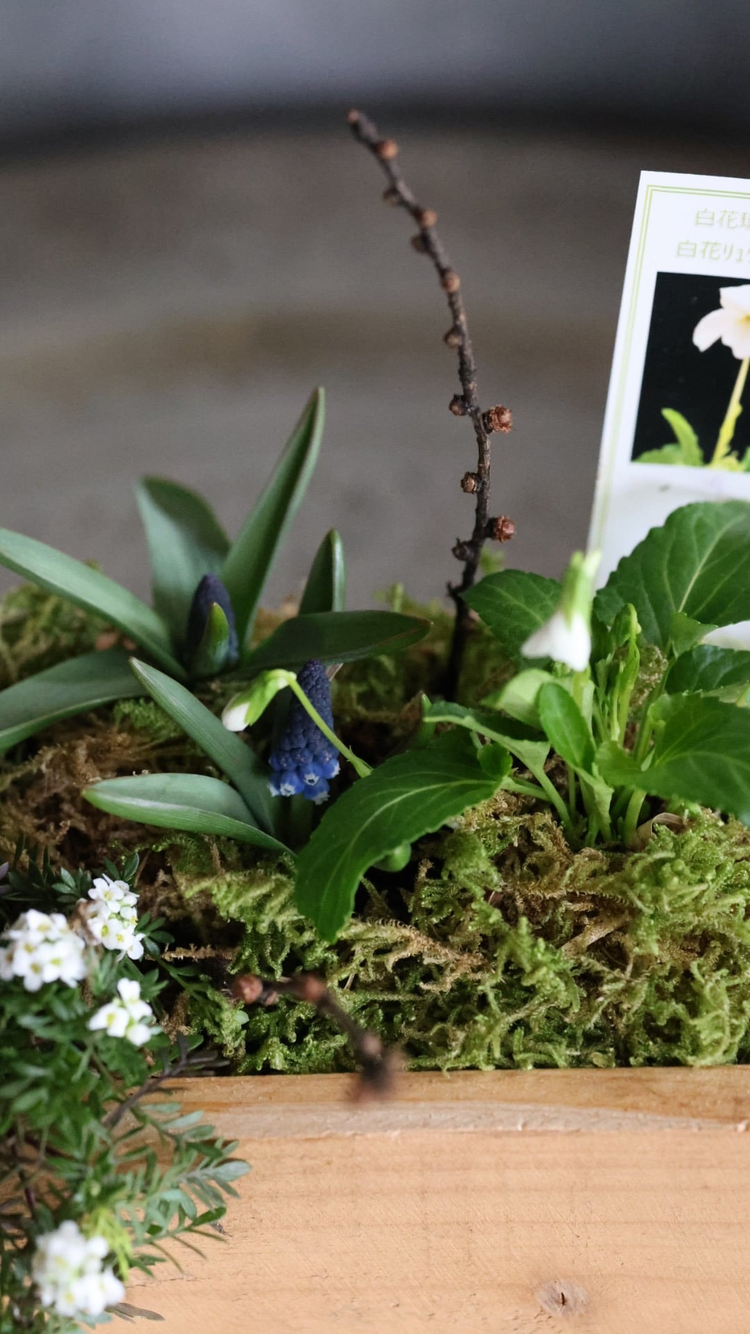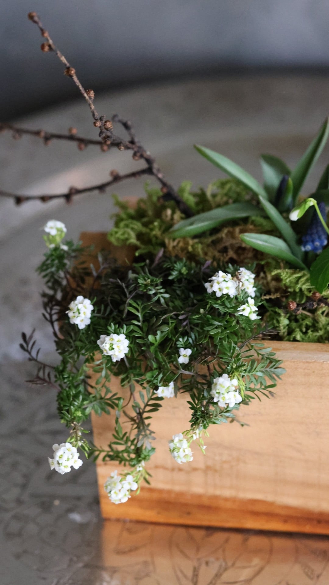 木箱に春をお知らせしてくれる小さな植物たちの寄せ植えを作りました。