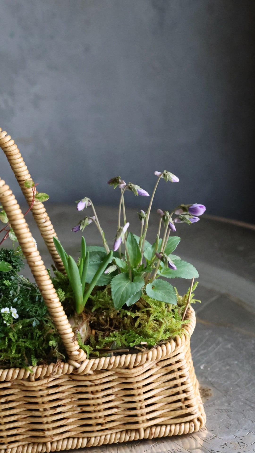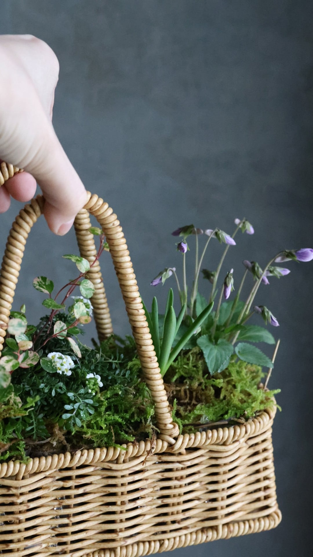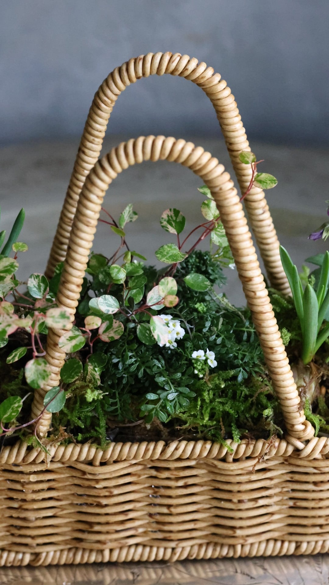 カゴに春をお知らせしてくれる小さな植物たちの寄せ植えを作りました。