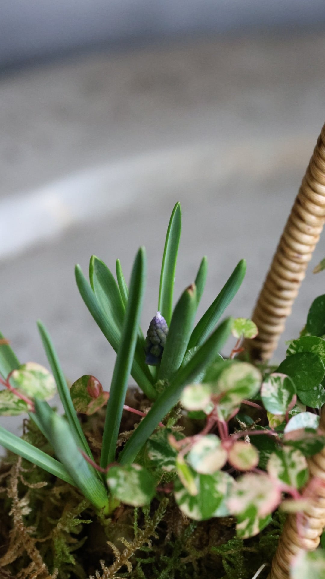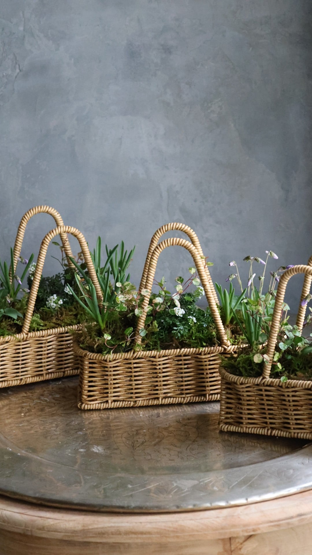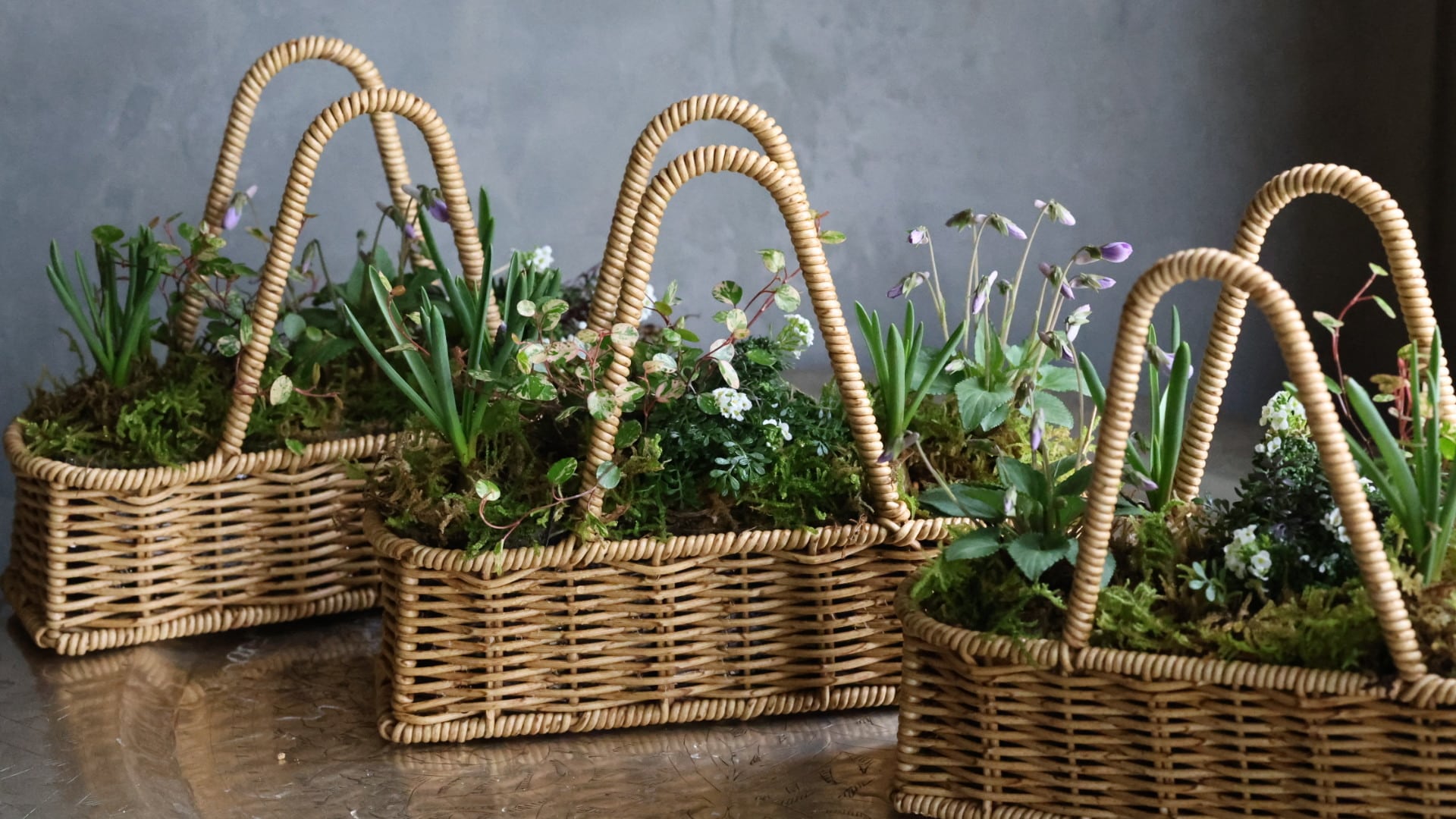 カゴに春をお知らせしてくれる小さな植物たちの寄せ植えを作りました。