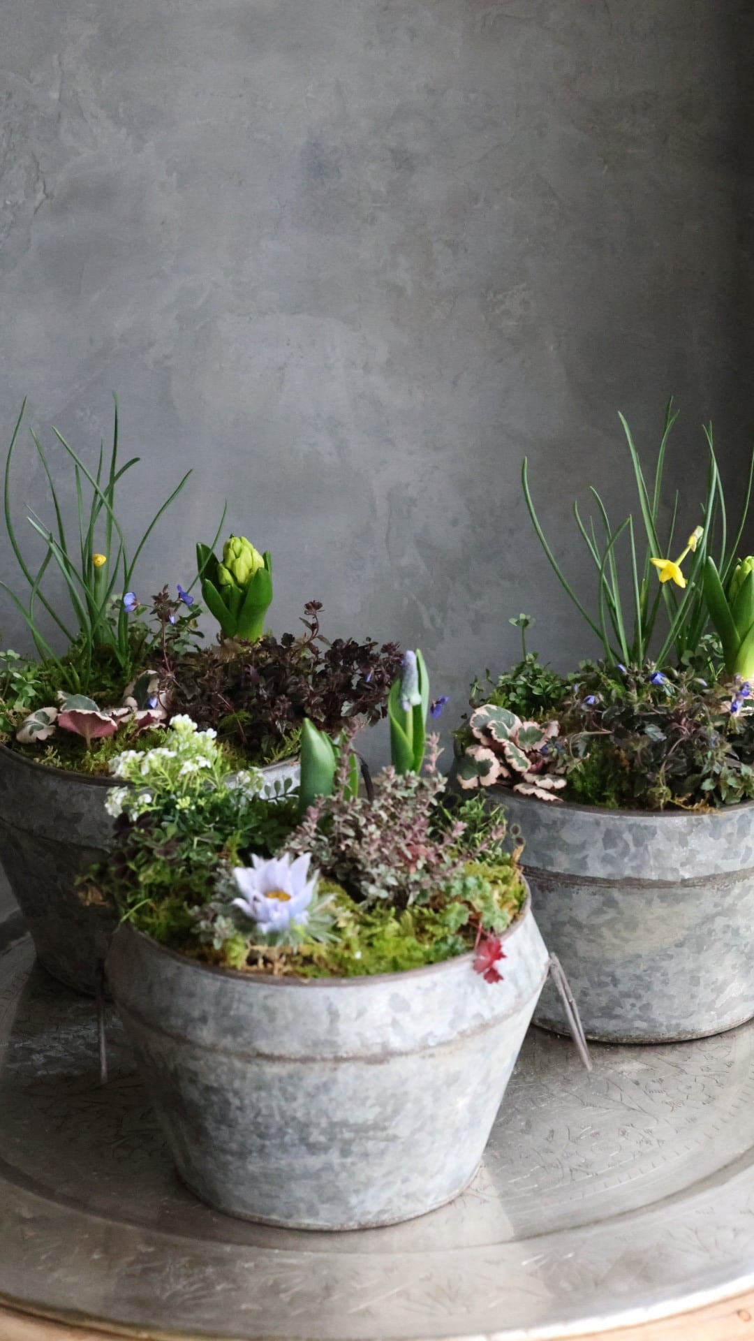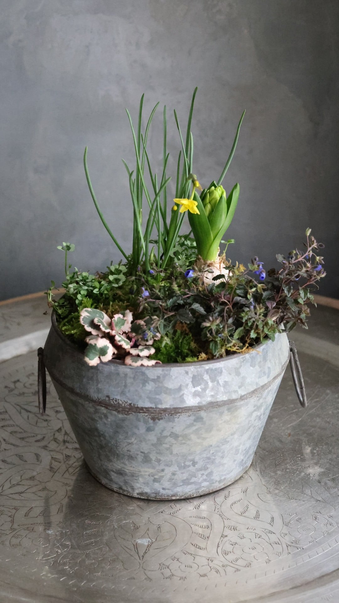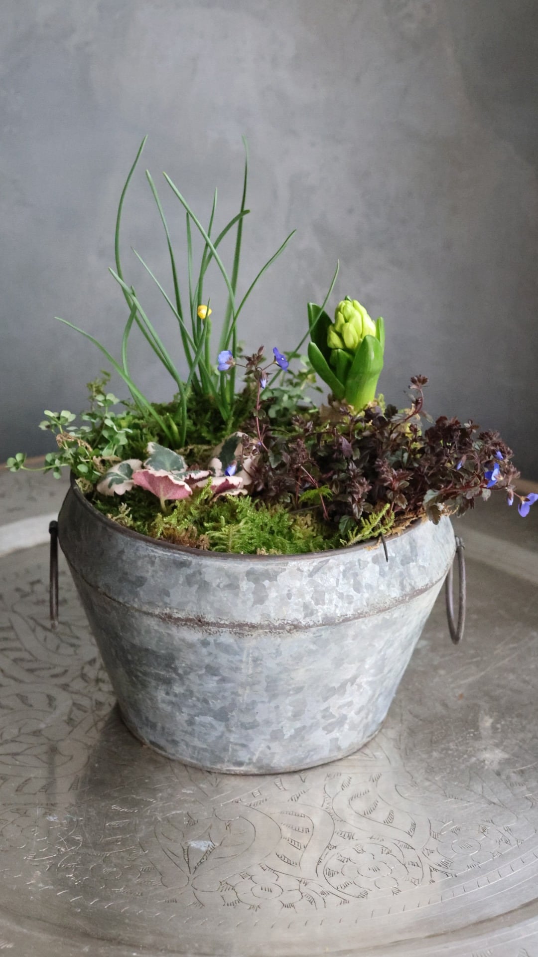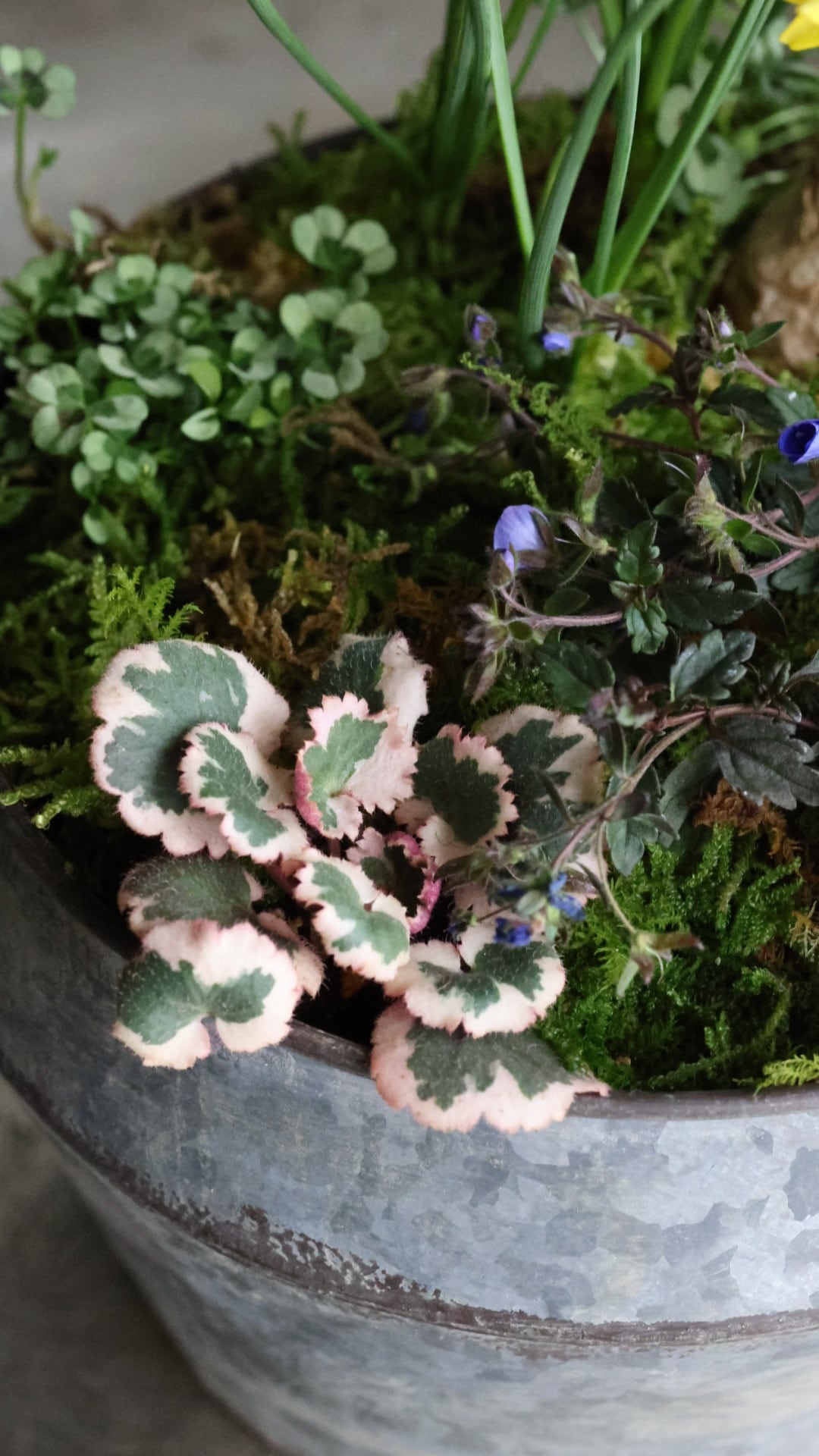 ブリキの器に春をお知らせしてくれる小さな植物たちの寄せ植えを作りました。