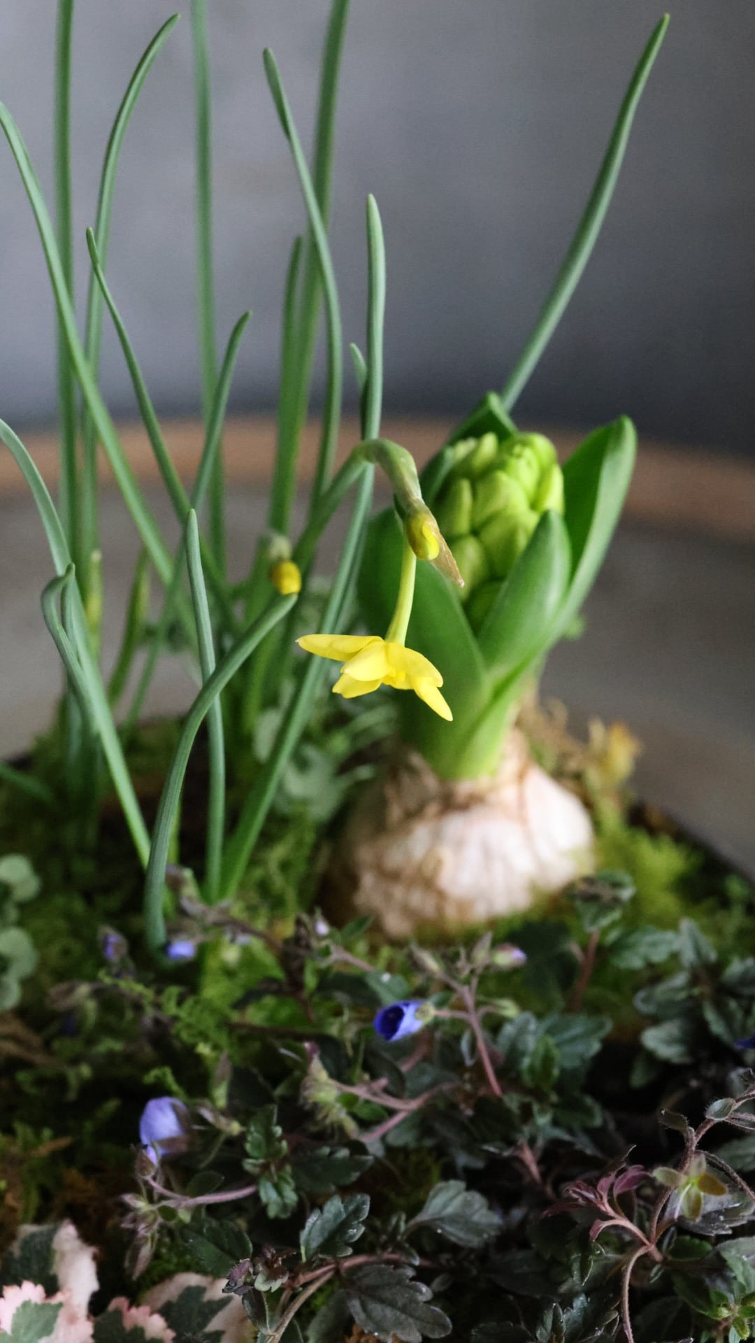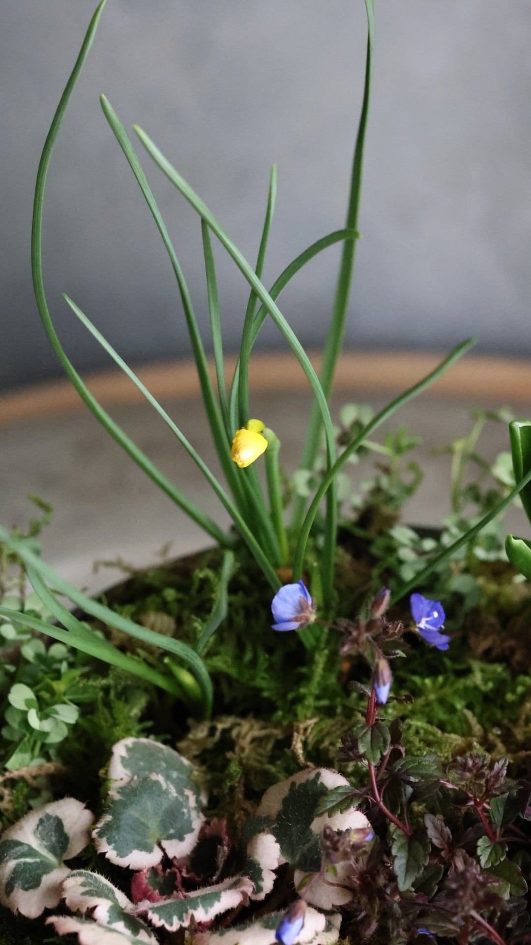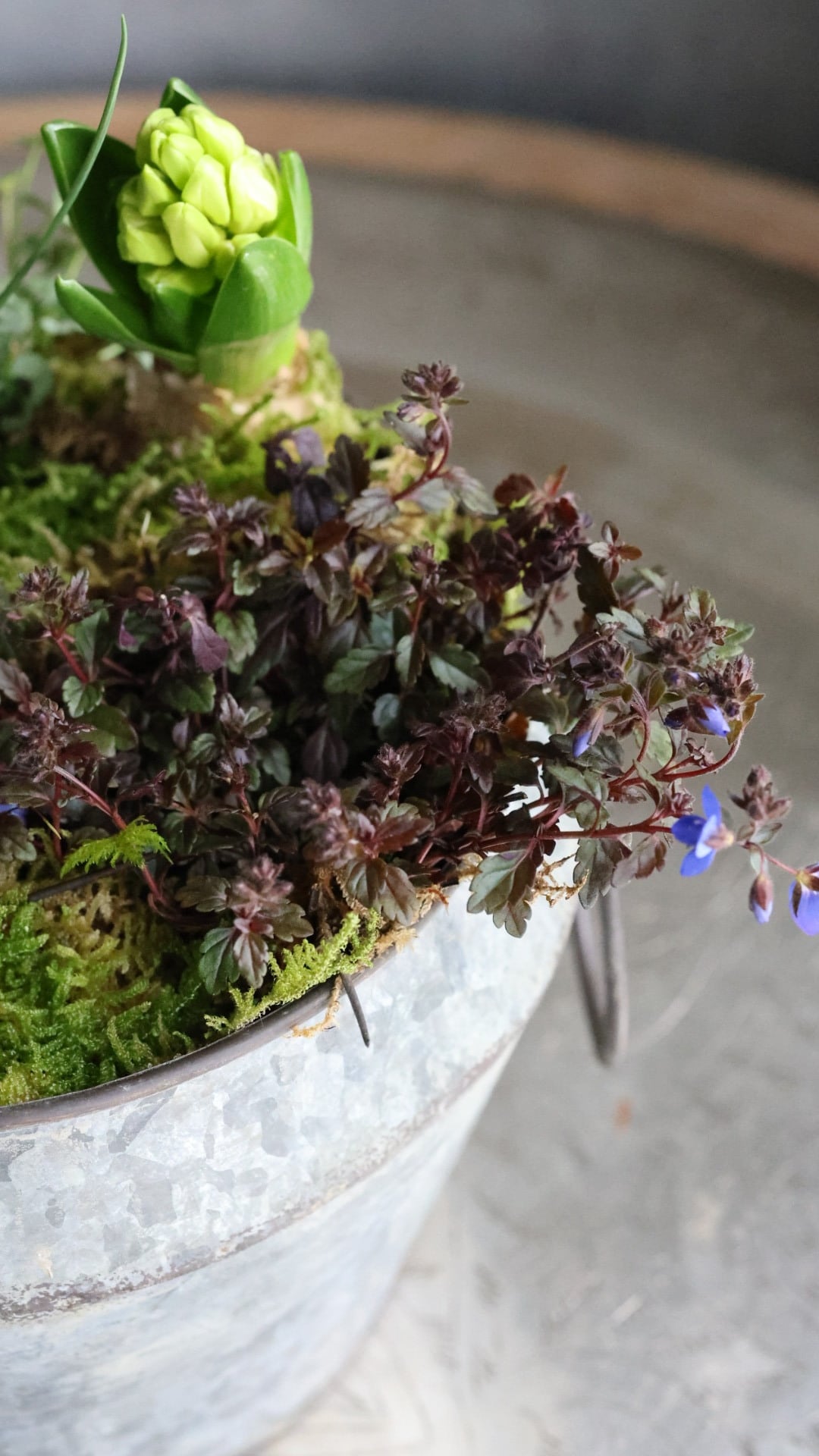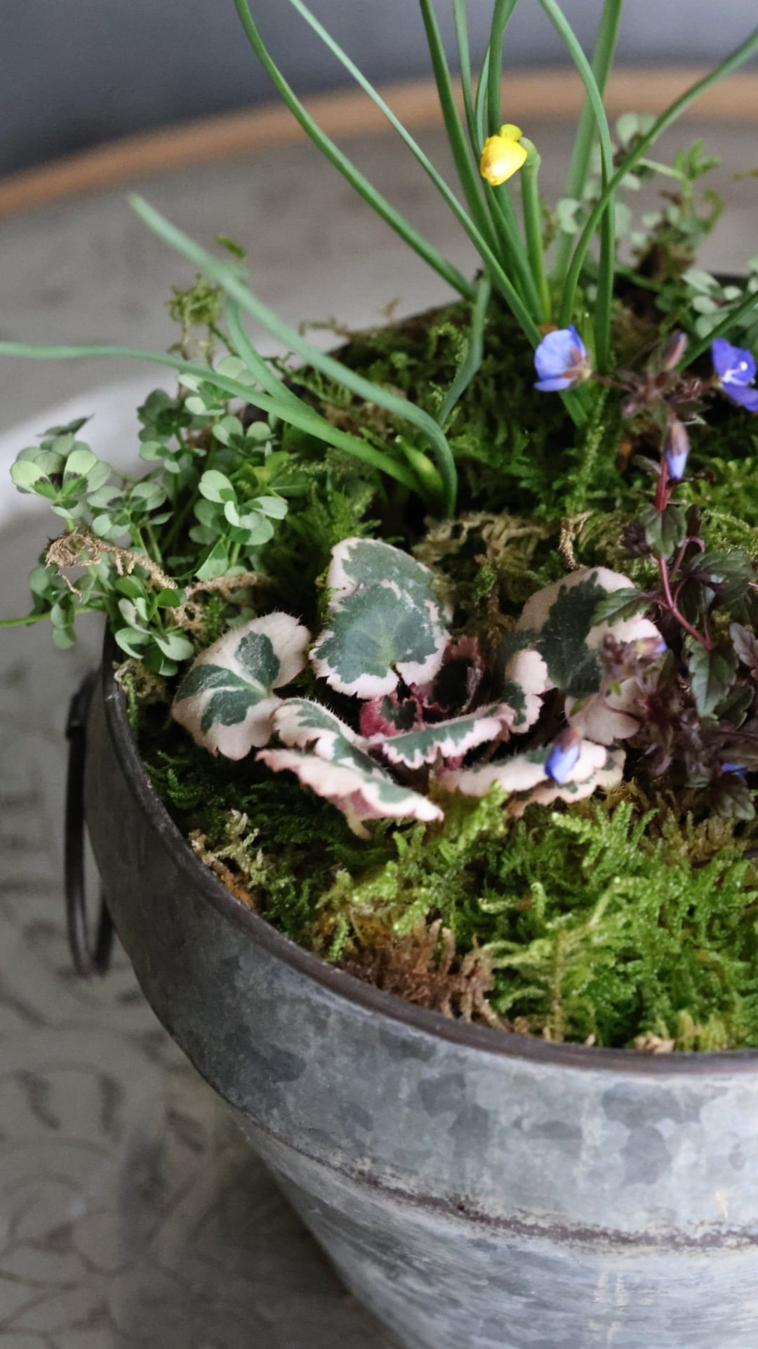 ブリキの器に春をお知らせしてくれる小さな植物たちの寄せ植えを作りました。