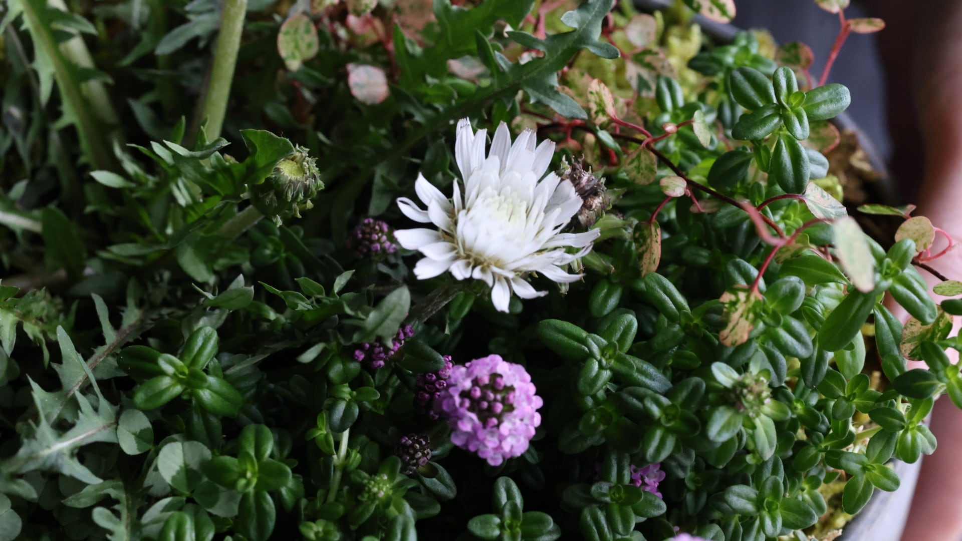 先終わったあとの綿毛も可愛い。見どころたくさんの寄せ植えです。