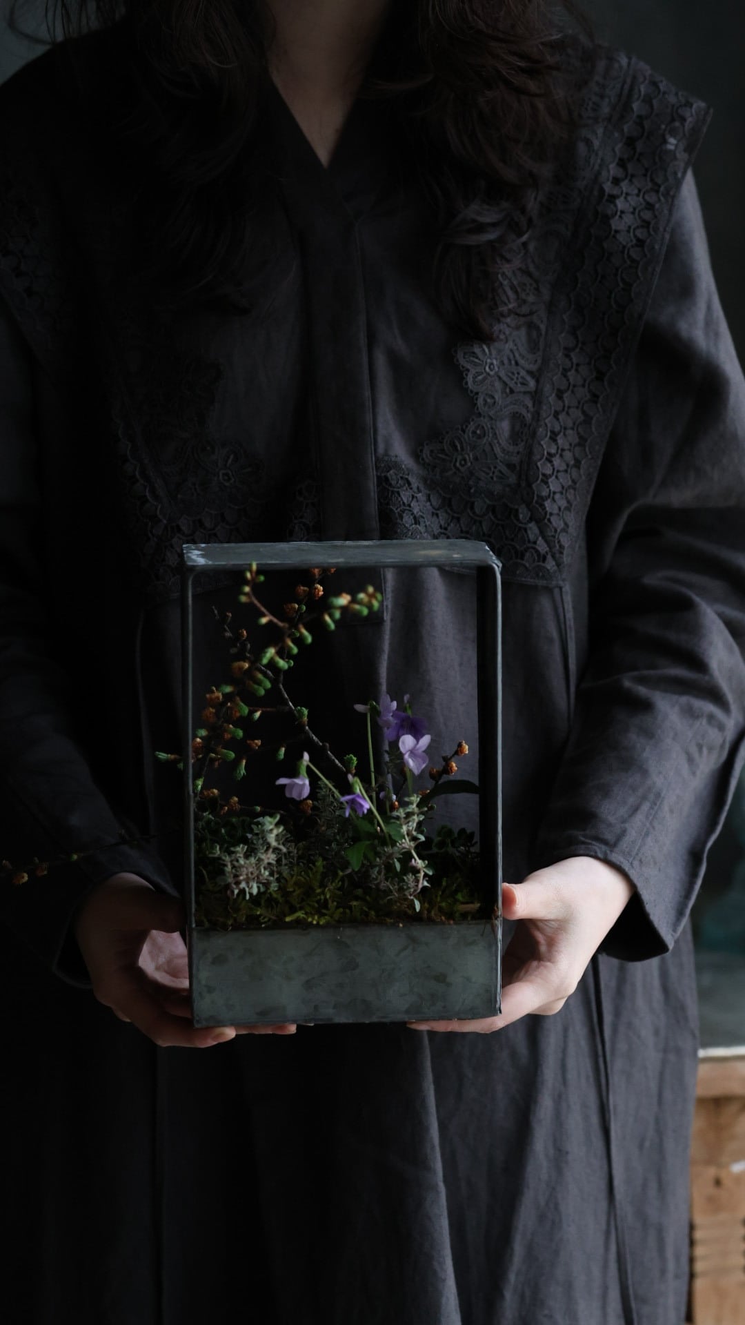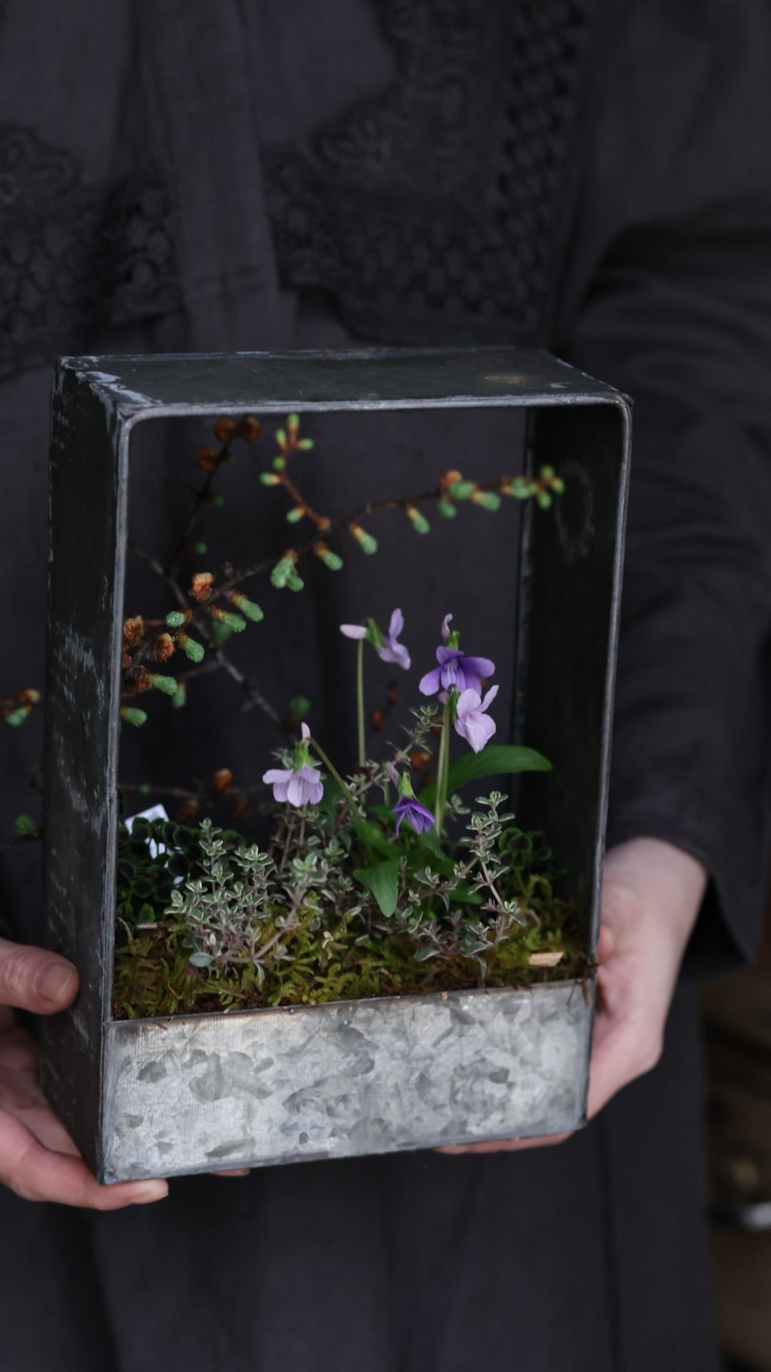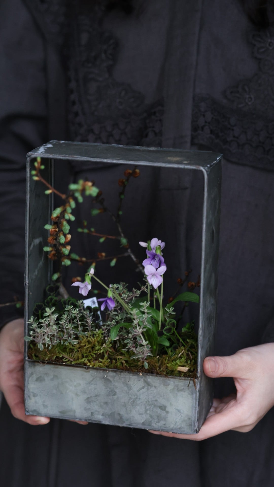 薄白先駆スミレが主役の春の里山を思う寄せ植えです。