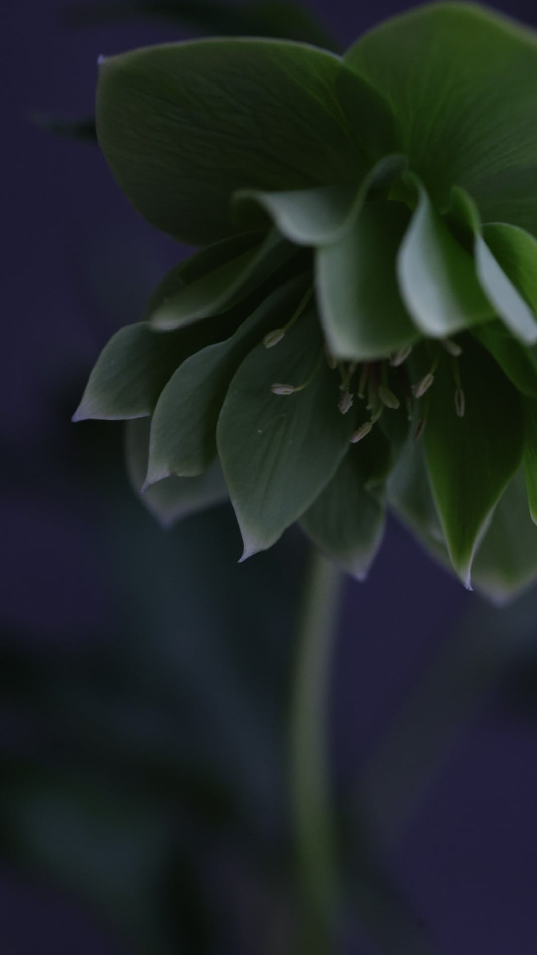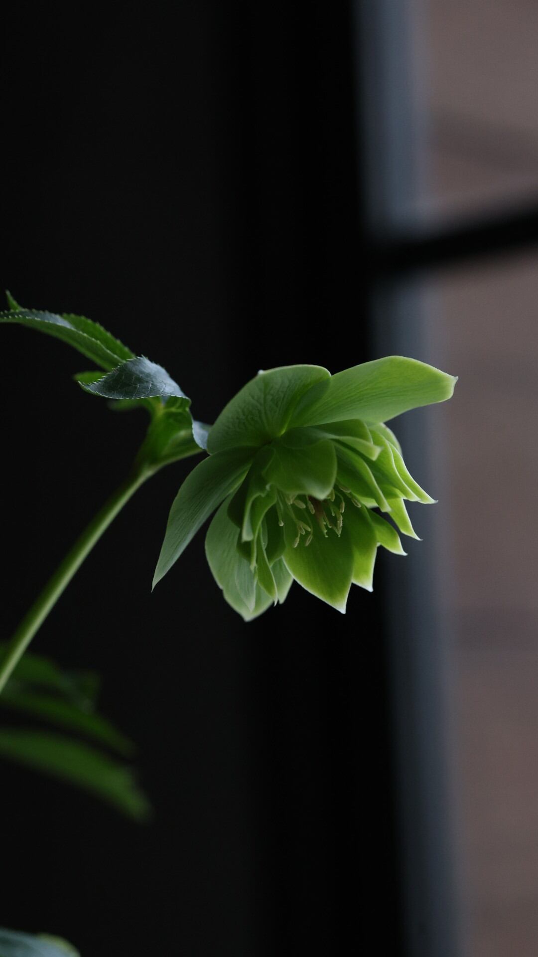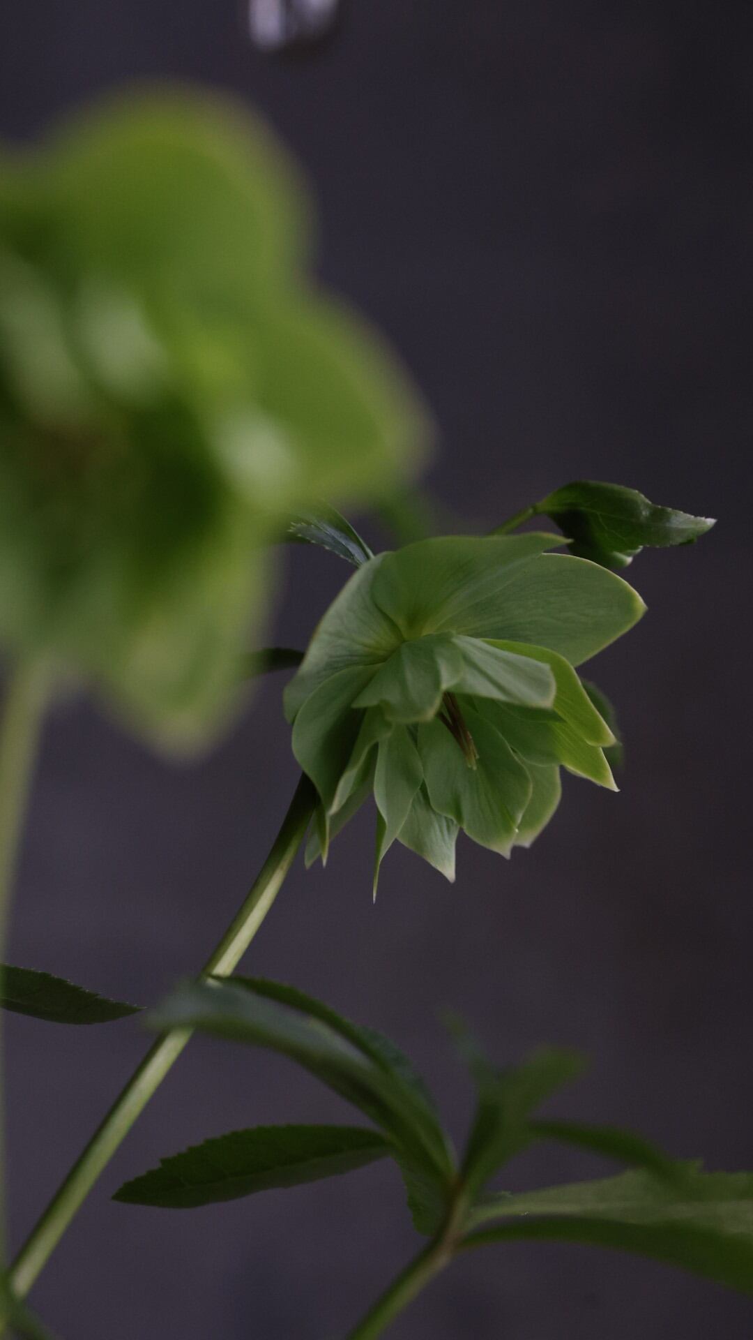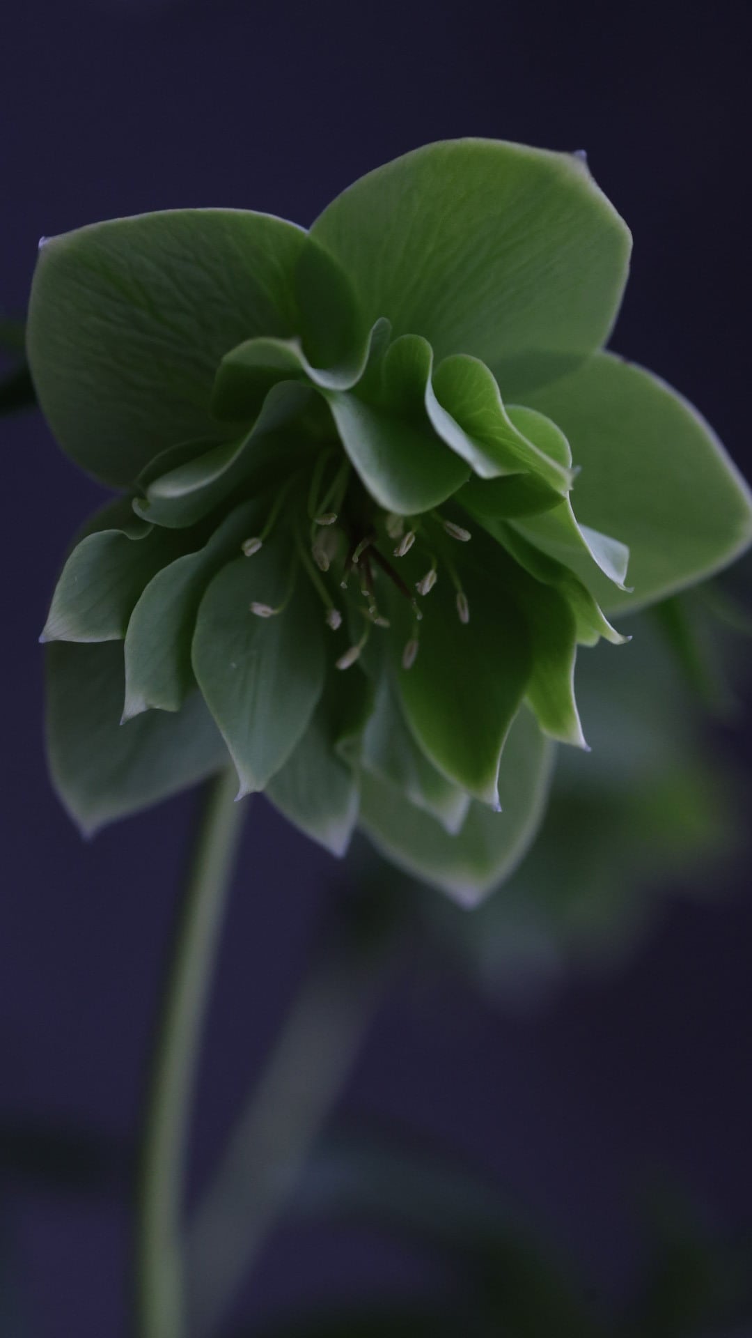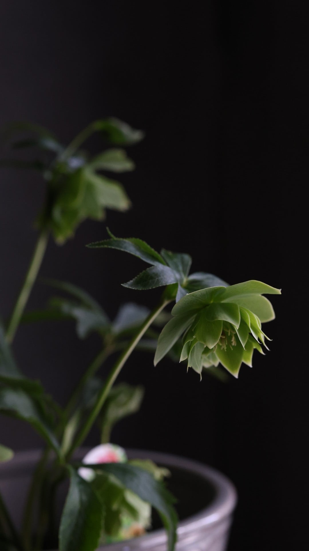 美しいグリーンのダブル。萼片の先が白く抜けています。陽に透かすと白い縁取りがうっすら現れて神秘的。グリーンのクリスマスローズは大好きでついついたくさん仕入れてしまいますが、アンティークで渋い物が多い中、この株は独特なニュアンスのおかげでとても軽やか。