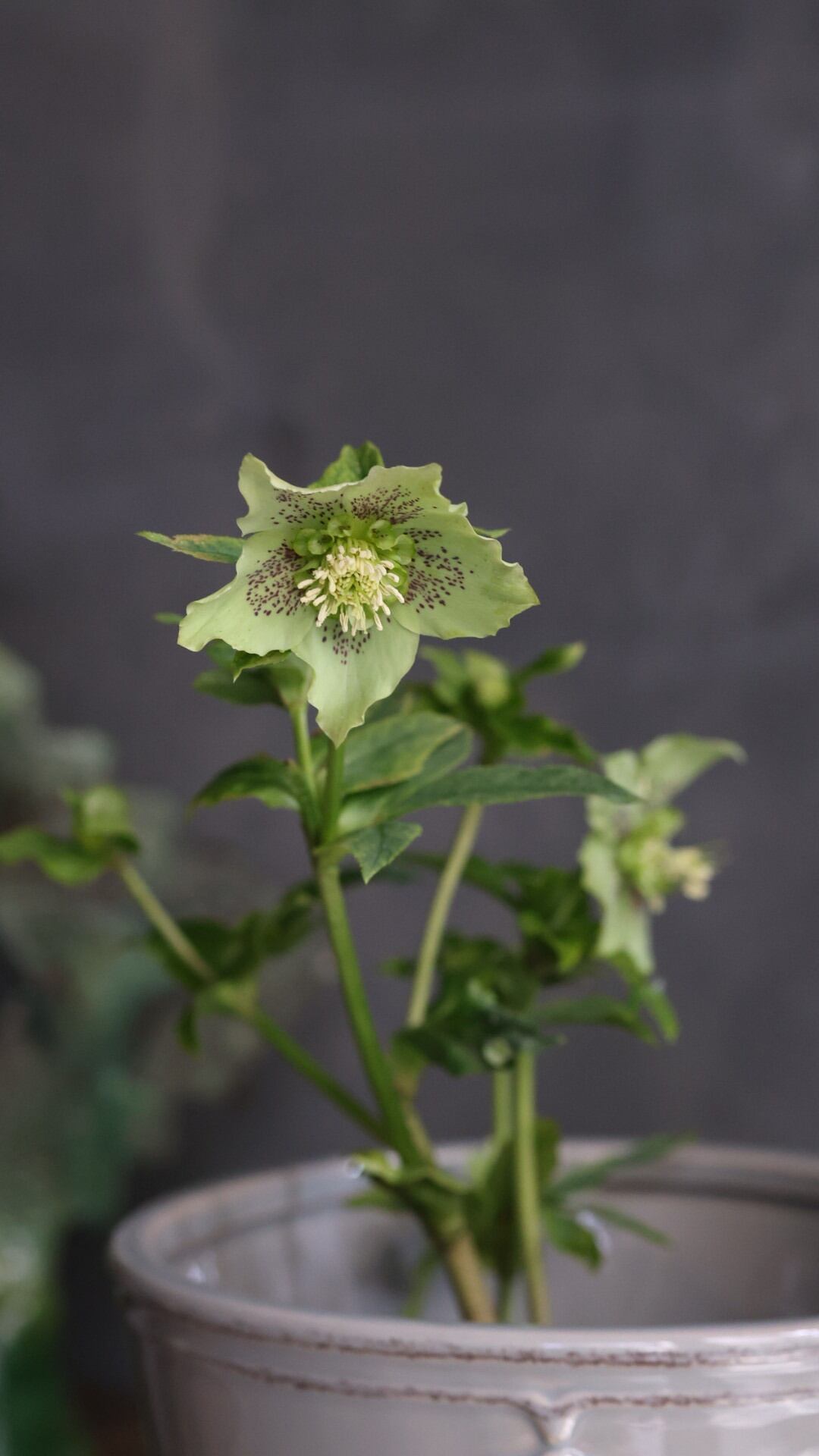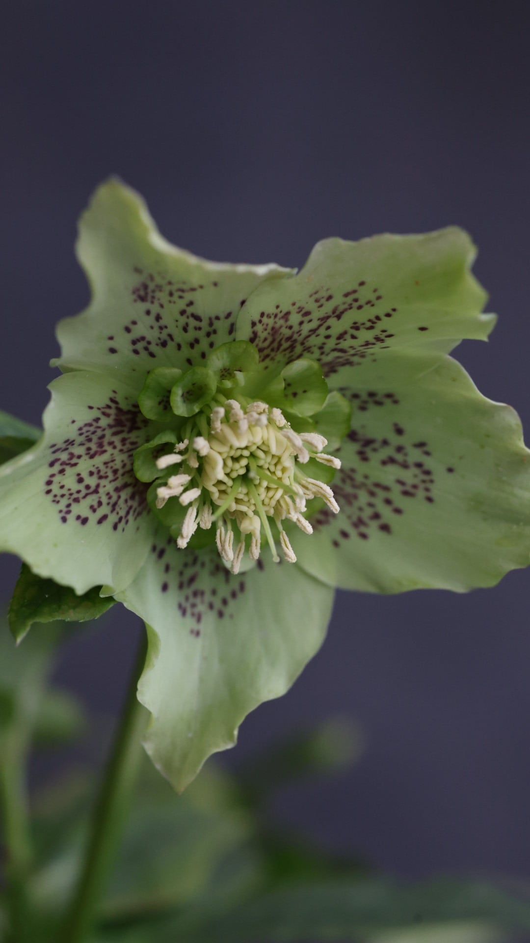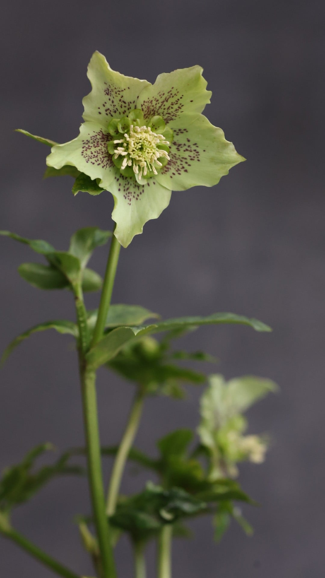 剣弁咲きに優しいフリル。控えめなブロッチでオシャレしたセミダブルのクリスマスローズです。
