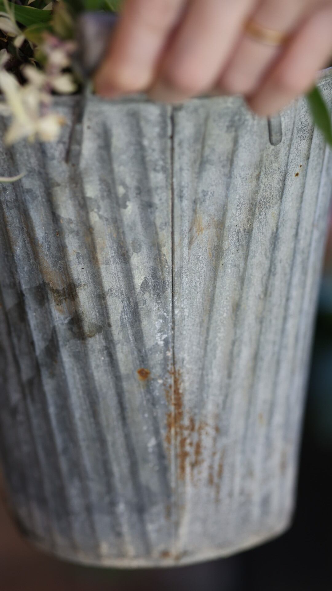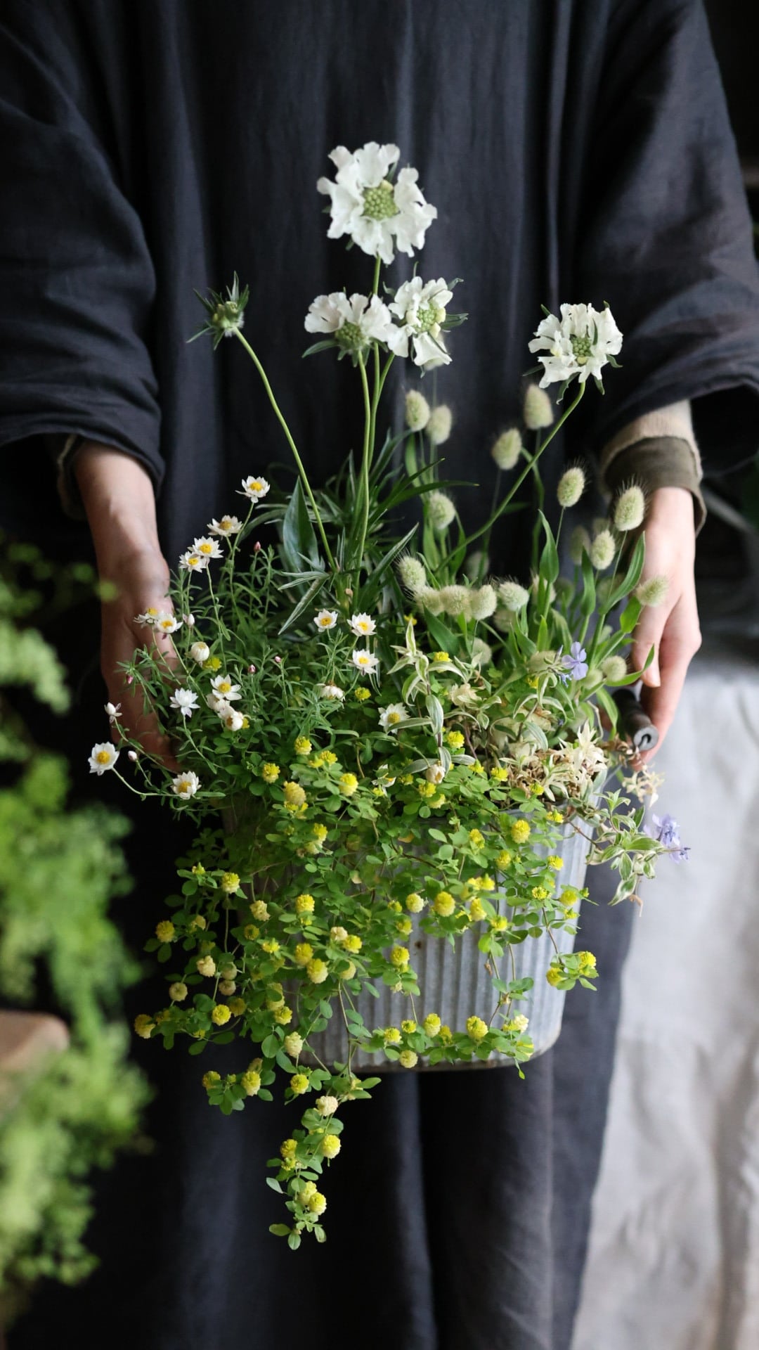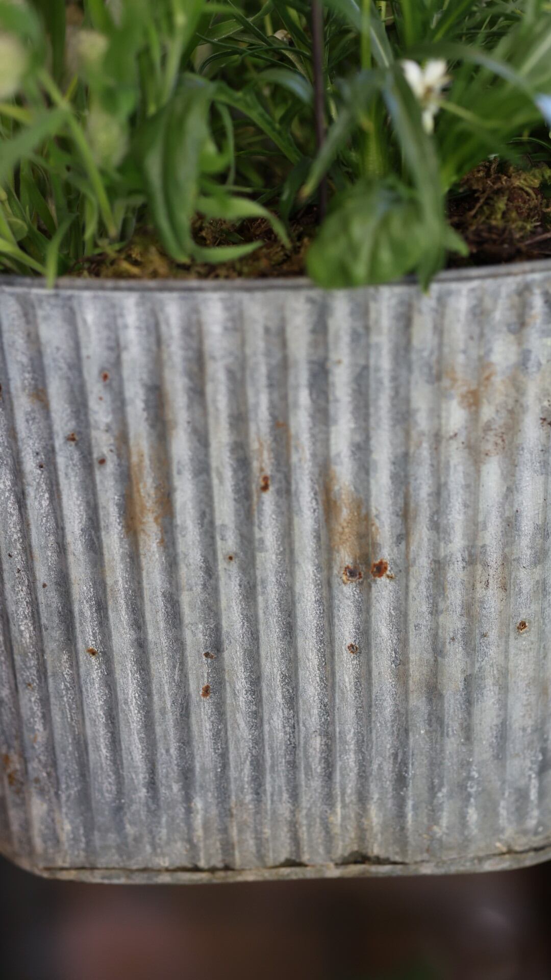 こちらはブリキの器に寄せ植えしております。