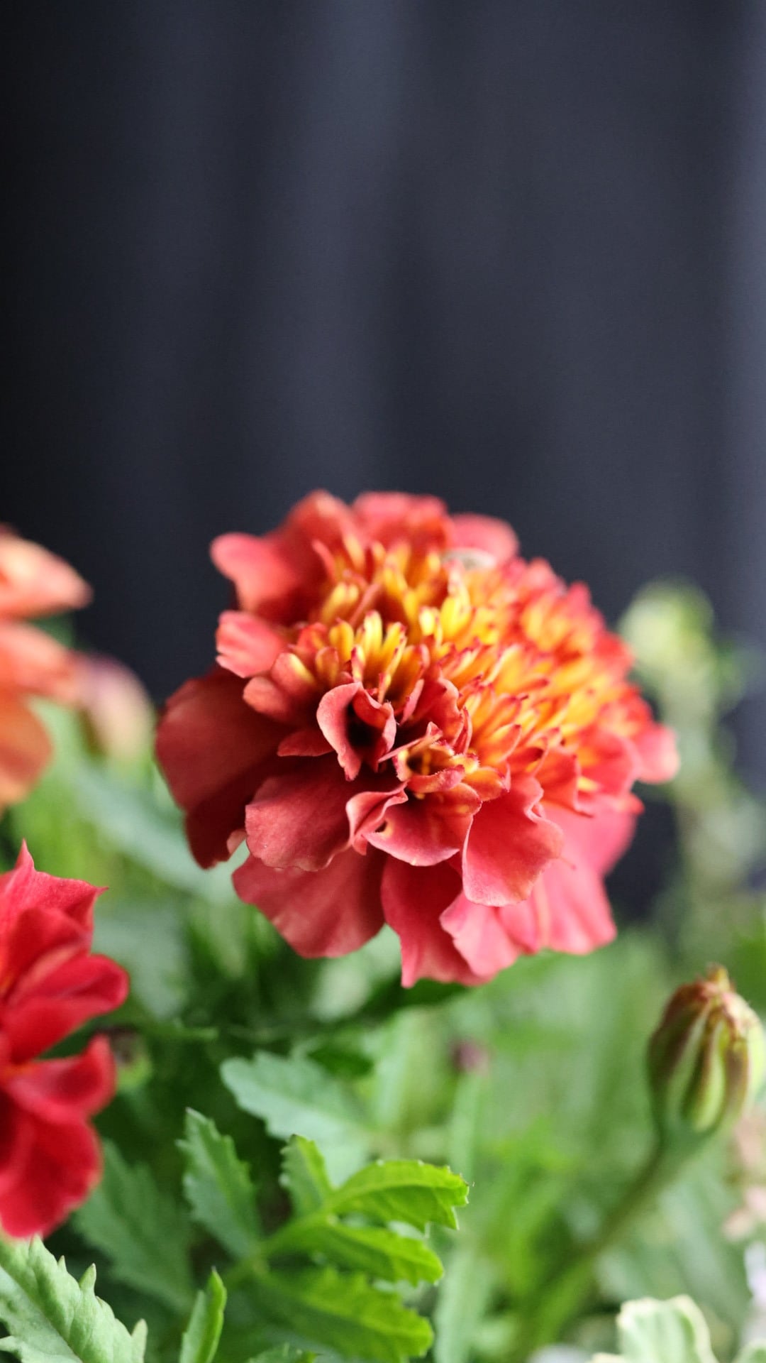 アンティークオレンジのマリーゴールドと爽やかなグリーンの組み合わせです。